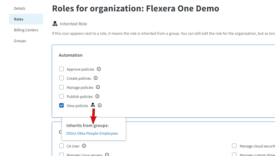 In Flexera One, all inherited roles are shown explicitly and can only be modified at the level they were assigned.