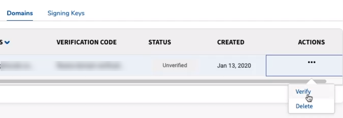 In the domain's corresponding Actions column, click the ellipses (...) and then click Verify.