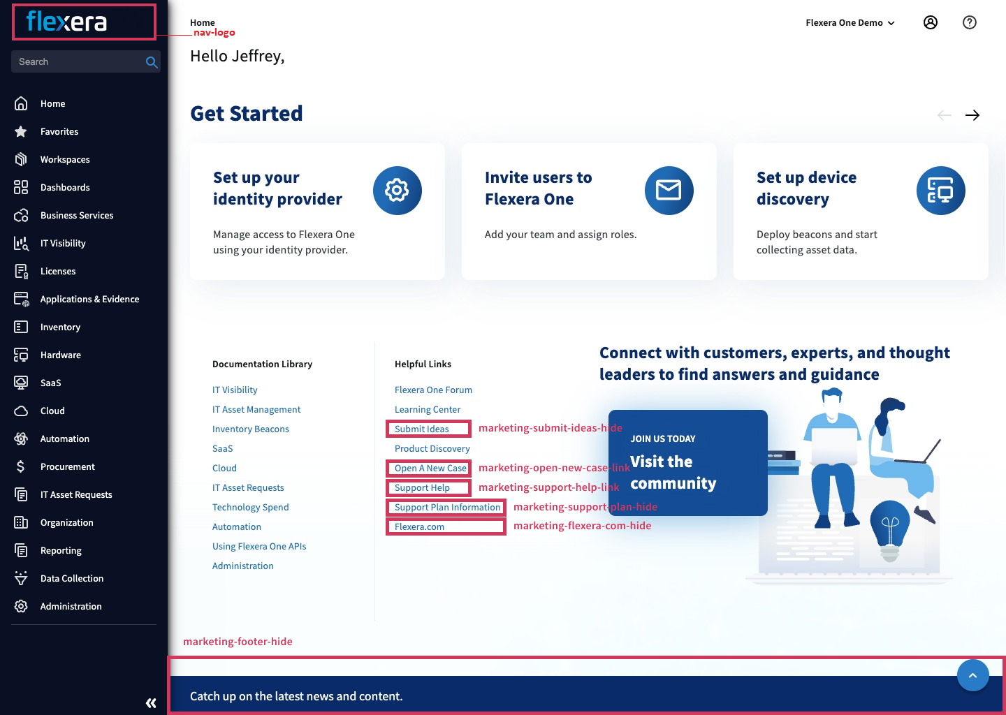 | marketing-flexera-com-hide | Bool | A boolean to determine show/hide of the Flexera.com link on the landing page. For visual reference of this item's location, see Landing Page. | True —Item is hidden. False—Item is visible. |