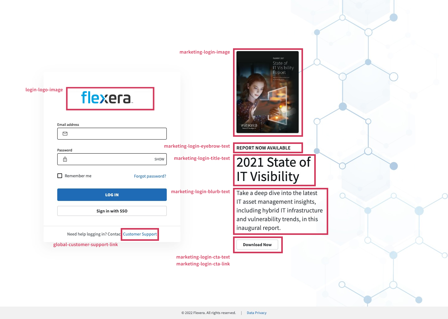 | marketing-login-image | URL | The web address of the image resource file location to use in place of the Flexera marketing section on the login page. For visual reference of this item's location, see Login Page. | Recommended pixel size—At most 300 horizontal pixels. At most 300 vertical pixels. Recommended style—Any. Recommended format—Any. A slight corner radius and drop shadow are applied to this image with CSS. |