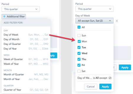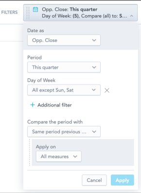 The following image shows a date filter that filters to workdays (Monday to Friday) in the current quarter and compares the data to the same period of the previous year: