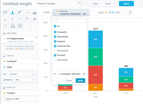 If you add the attribute to filter the insight first and then you add unrelated measures or attributes to the Measure(s) section, the attribute stays in the insight but does not filter the data. Data Explorer displays an informative message. If your attribute has multiple display labels, you can select the label in the filter definition.