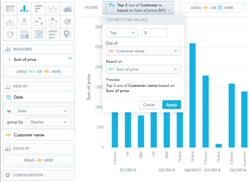 Filter the whole insight by a number of top/bottom values. For more information, see Ranking Filter.