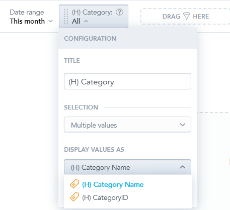 To customize the attribute filter such as changing its display name, the type of selection, and the way the individual attribute’s values are displayed, click the attribute filter, and then click the Configuration icon. The Configuration properties box opens. You can do the following: