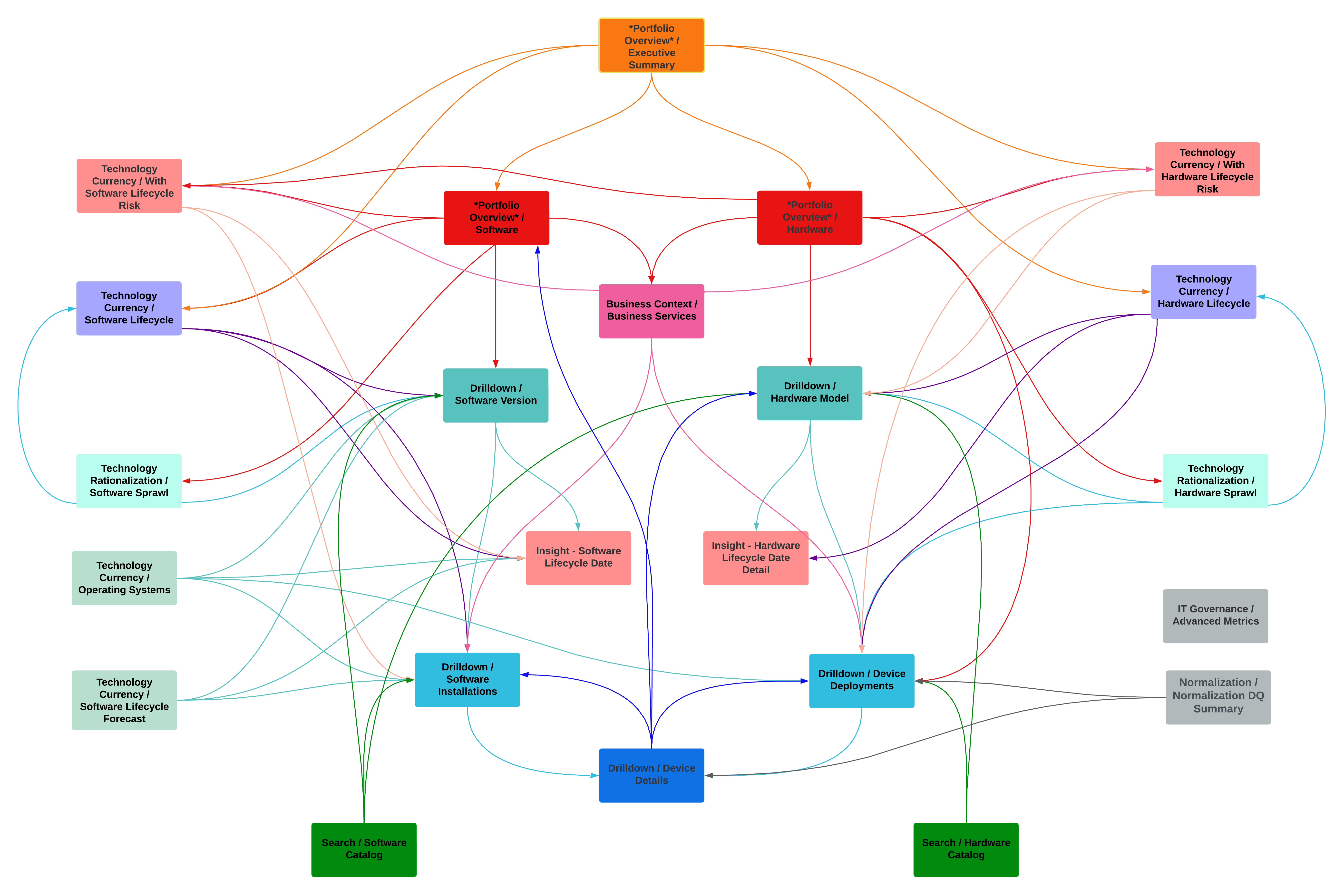 | *Portfolio Overview* / Software Summary | Provides a high level overview of your software portfolio with tables, charts, and graphs that summarize your deployed software counts and lifecycle stages. The Software Summary dashboard also shows insights into your software sprawl and lifecycle/currency risk by category and other aspects of your IT estate (such as software categories that are end of life or obsolete). This dashboard has drill-down links to the following built-in dashboards: Software with Currency Risk Software Lifecycle Software Version Business Services |