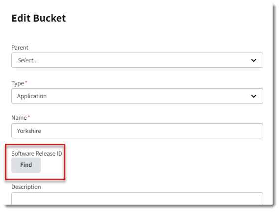 On the Create Bucket or the Edit Bucket slideout, locate the Software Release ID field. If necessary, refer to the instructions in Creating a Bucket or Editing a Bucket for accessing either slideout.